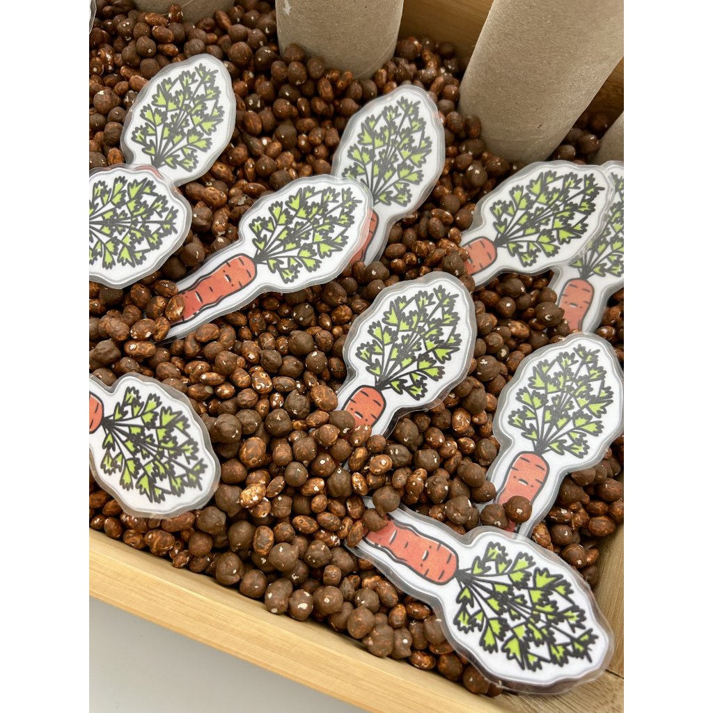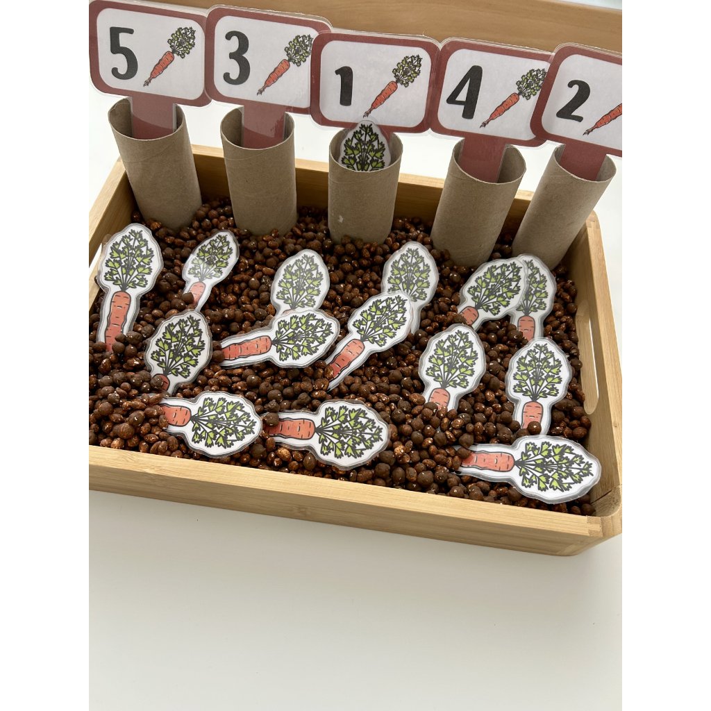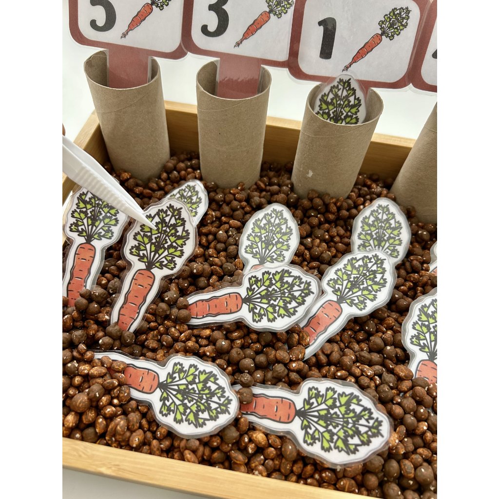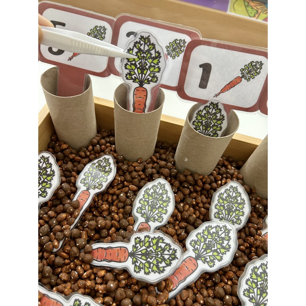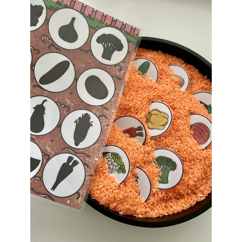- smyslové hry (hledání mrkví, třídění jablíček, odkrývání zeleniny pod rýží/pískem)