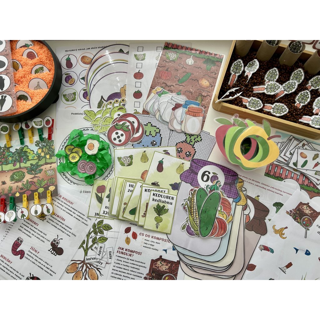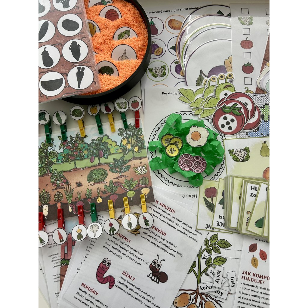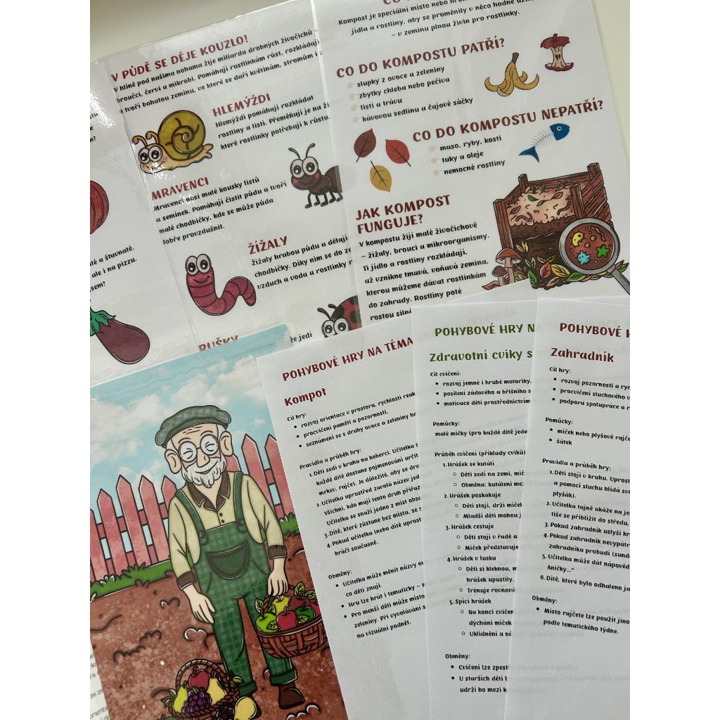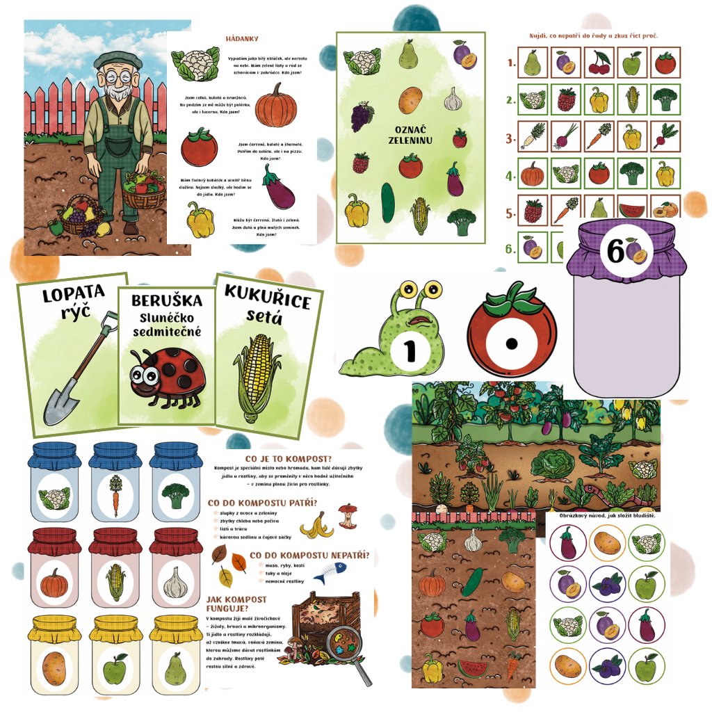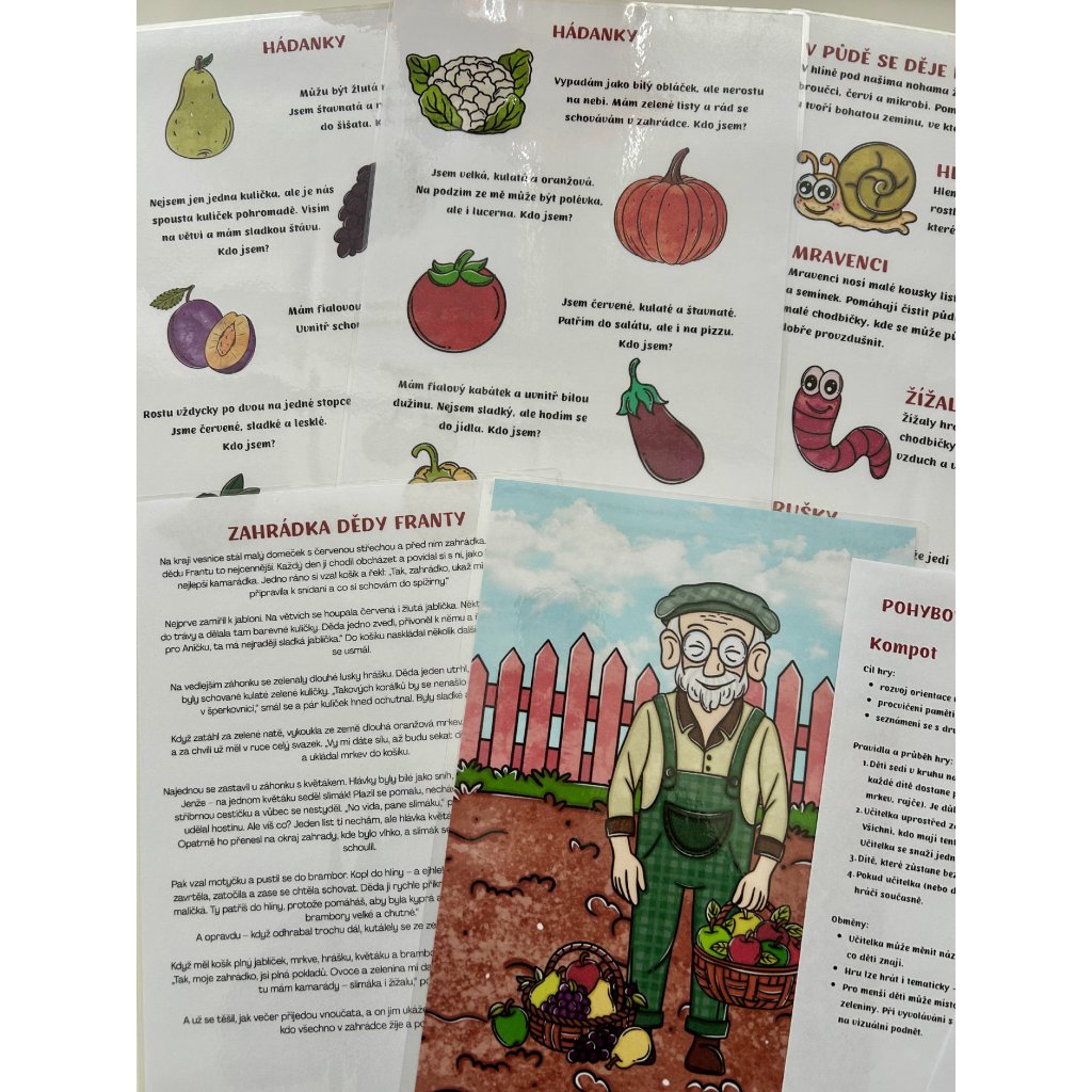 Součástí materiálu je krátký příběh o dědovi Frantovi a jeho zahrádce doplněný celostránkovou ilustrací, která děti motivuje a vtáhne do tématu. Na příběh navazují pohybové hry, hádanky, demonstrační kartičky, pracovní listy i řada praktických aktivit se smyslovými prvky, při kterých děti využívají např. rýži, písek, cizrnu nebo plastelínu.